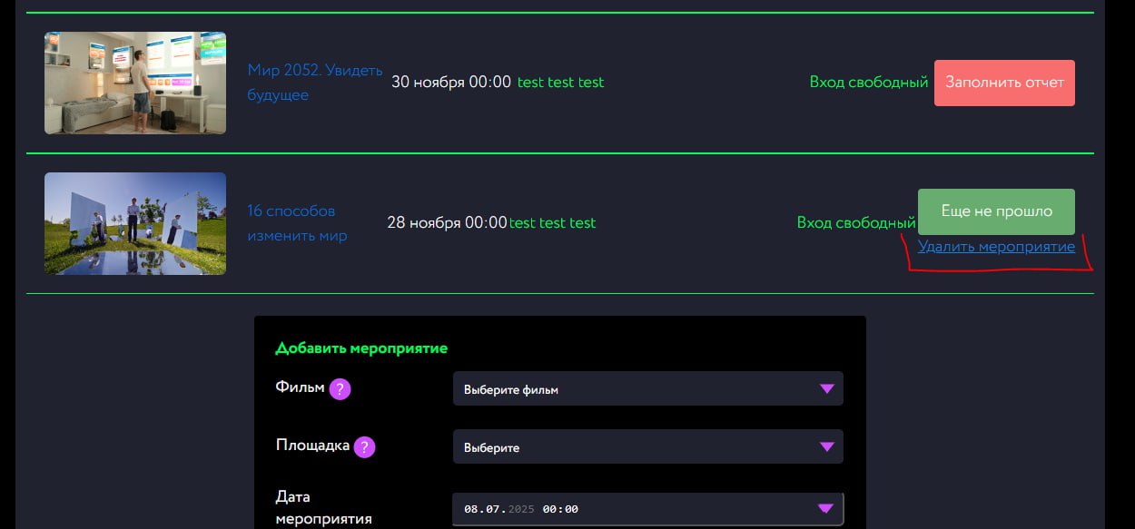 После проведения показа снова заходите во вкладку “Мероприятия” для заполнения отчета по конкретному показу (в течение 3 рабочих дней).